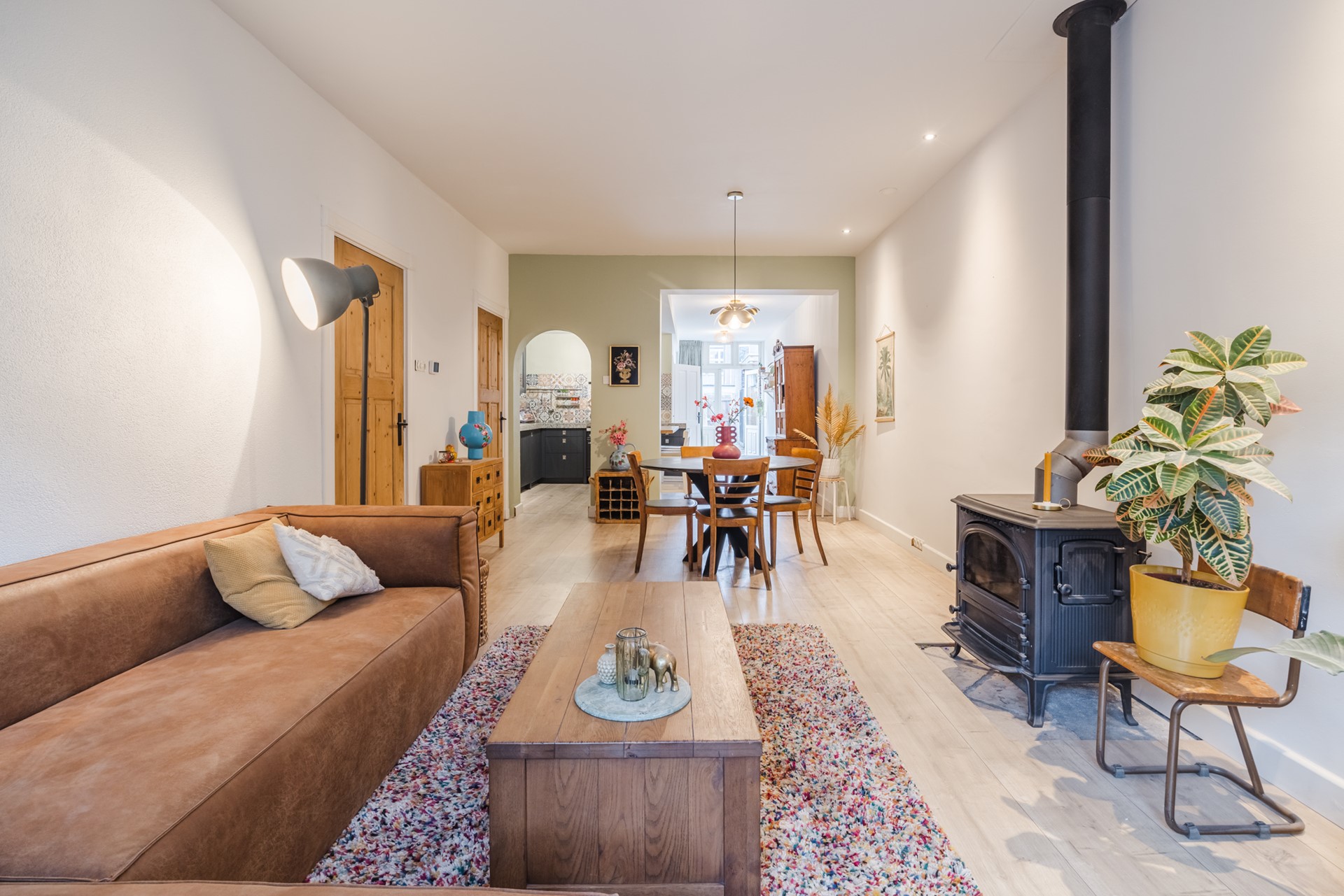 Direct bij binnenkomst merk je de fraaie hoogte van deze woning. Vanuit de entree/gang stap je de woonkamer in: een lichte, sfeervolle ruimte met een hout-laminaatdelenvloer, strak stucwerk, houtkachel en een handige kastruimte. De glas-in-lood-ramen aan de voorzijde benadrukken het historische karakter. De houten deuren voegen een extra stoer element toe. Door de grootte van de woonkamer is er volop ruimte voor zowel een (hoek-)bank en een gezellige eettafel.
