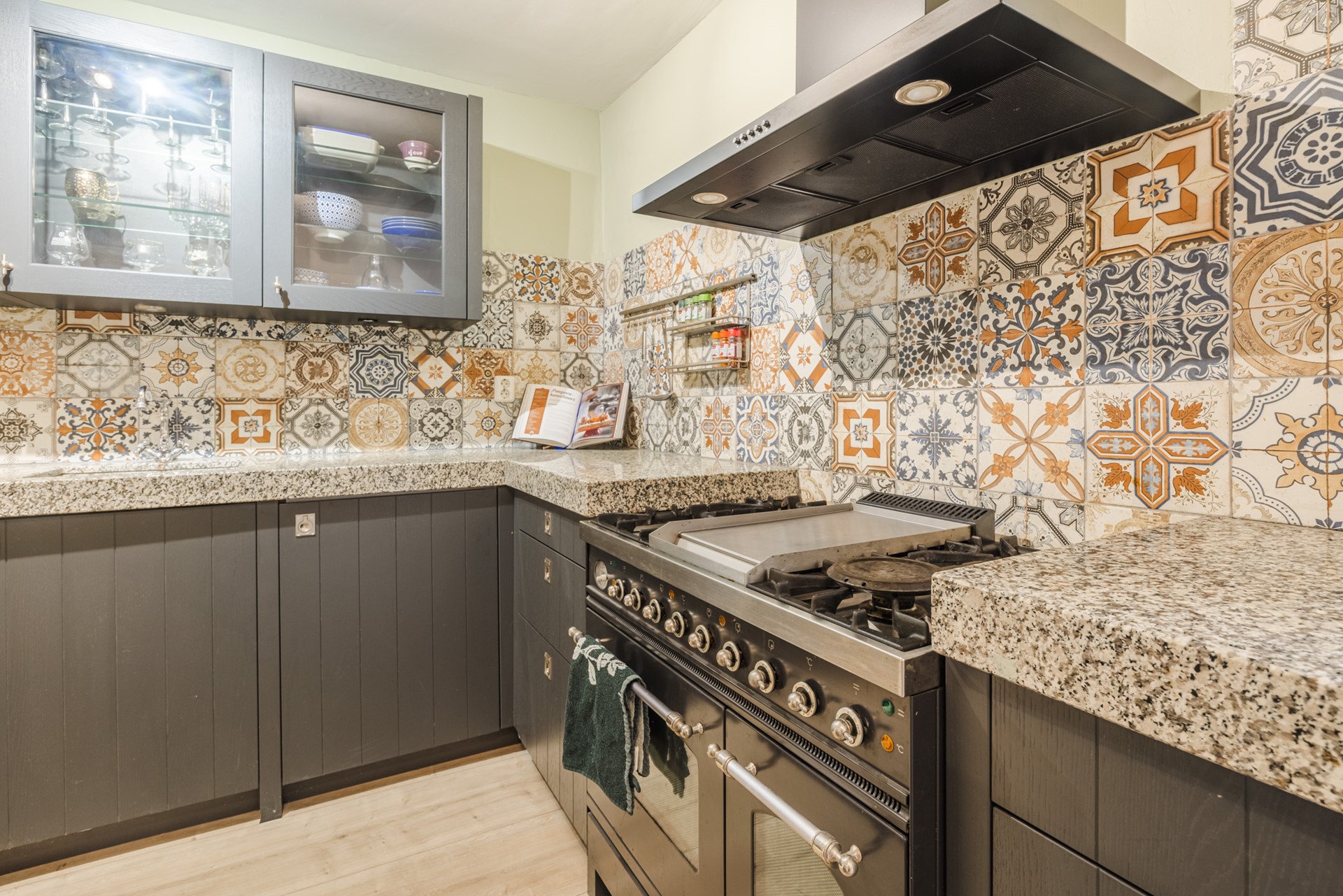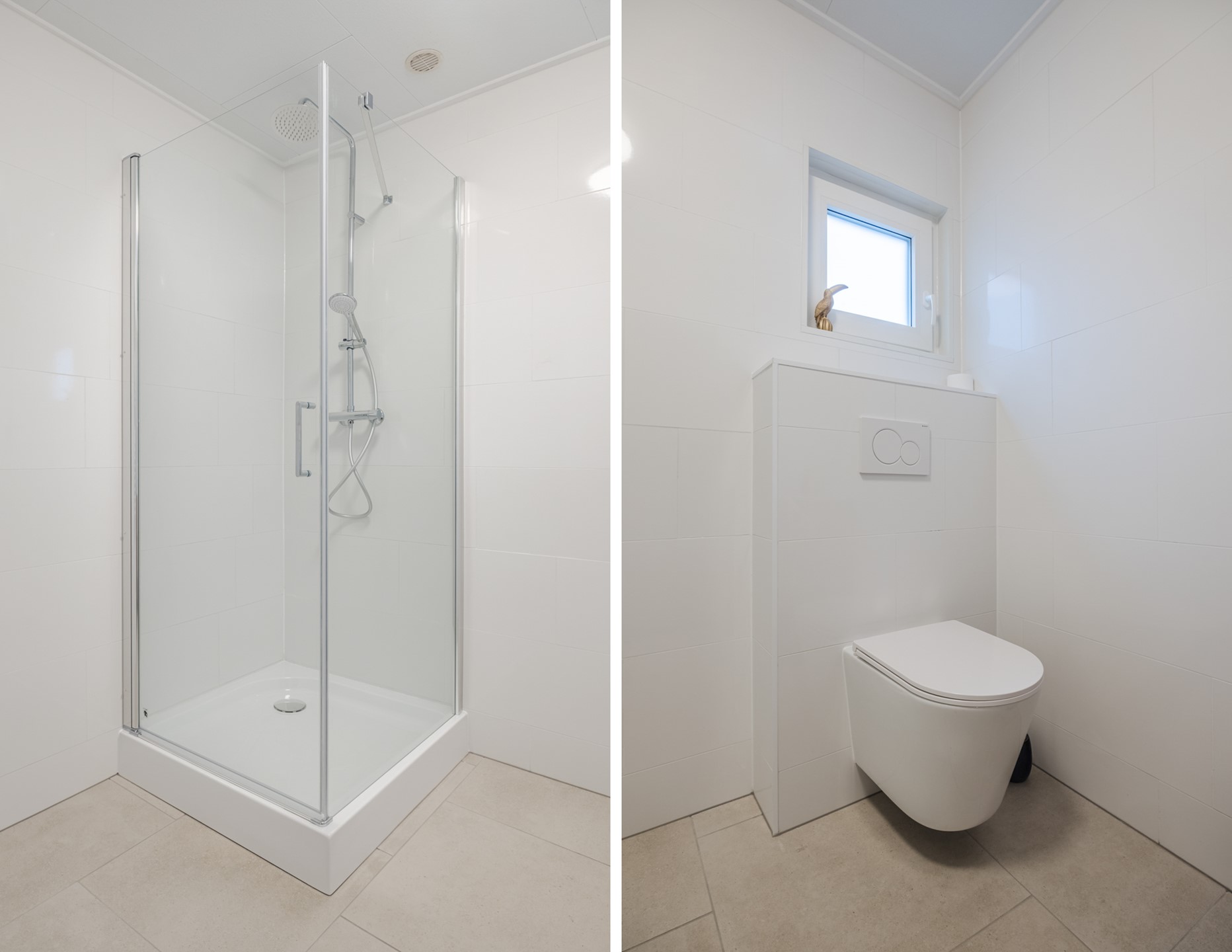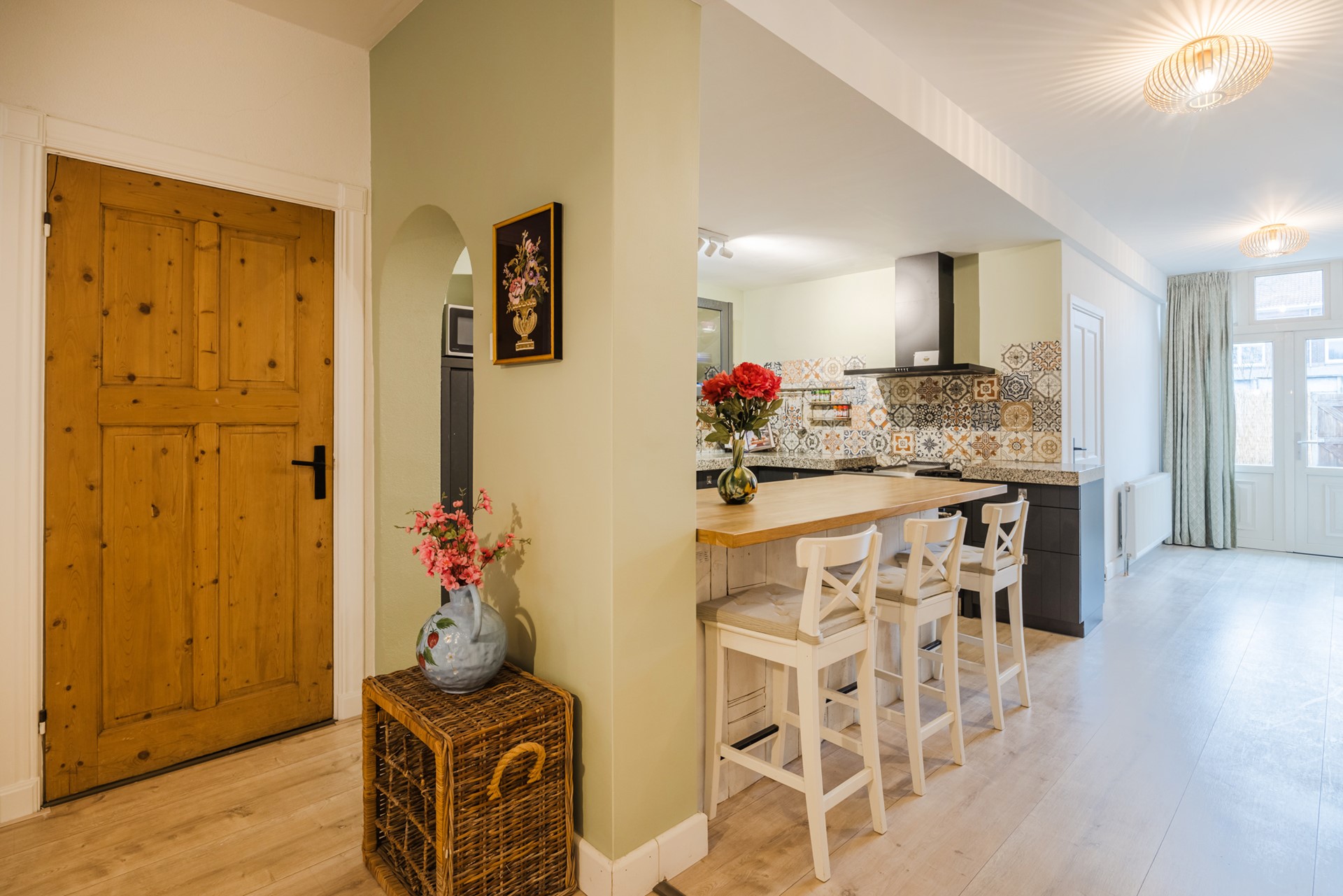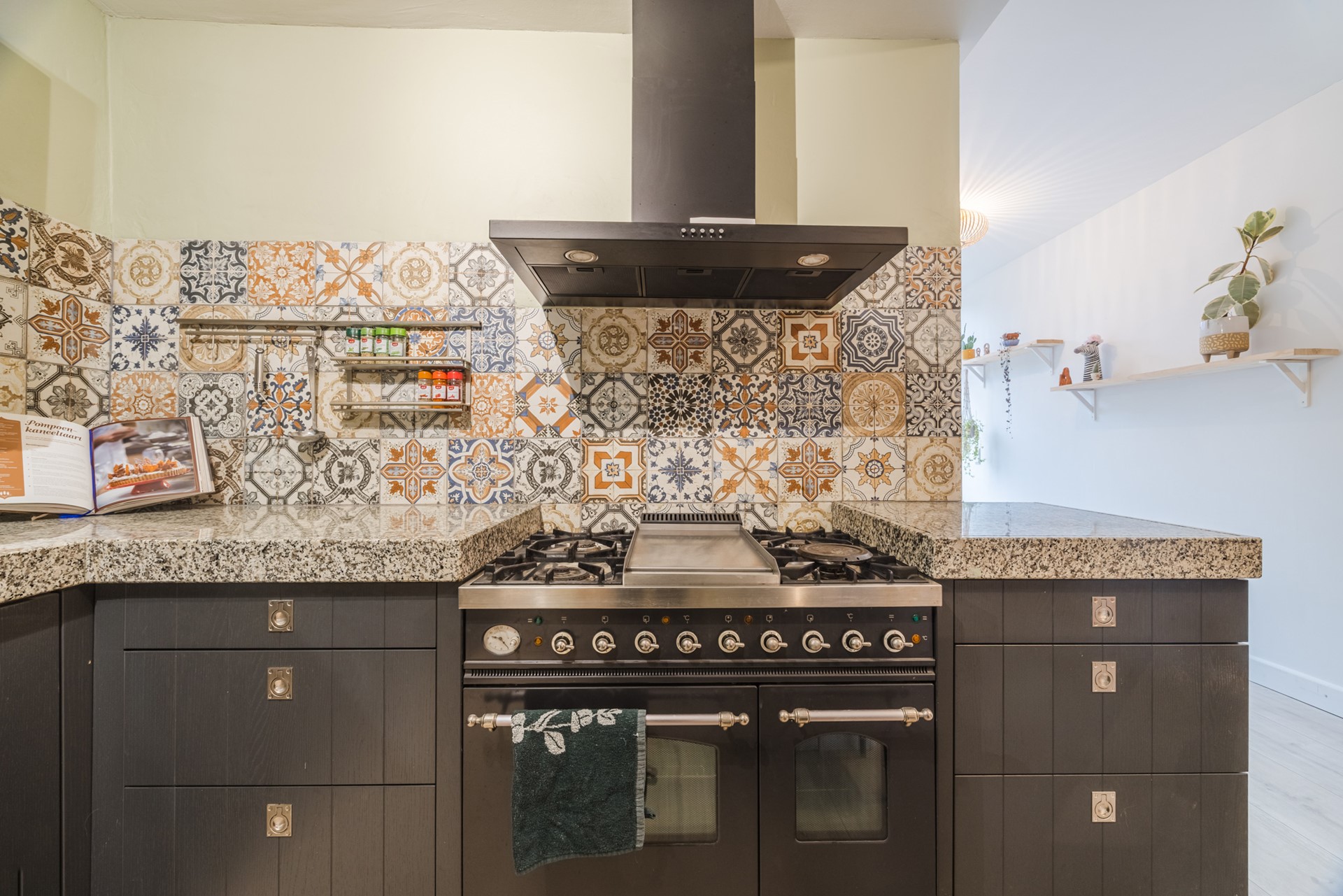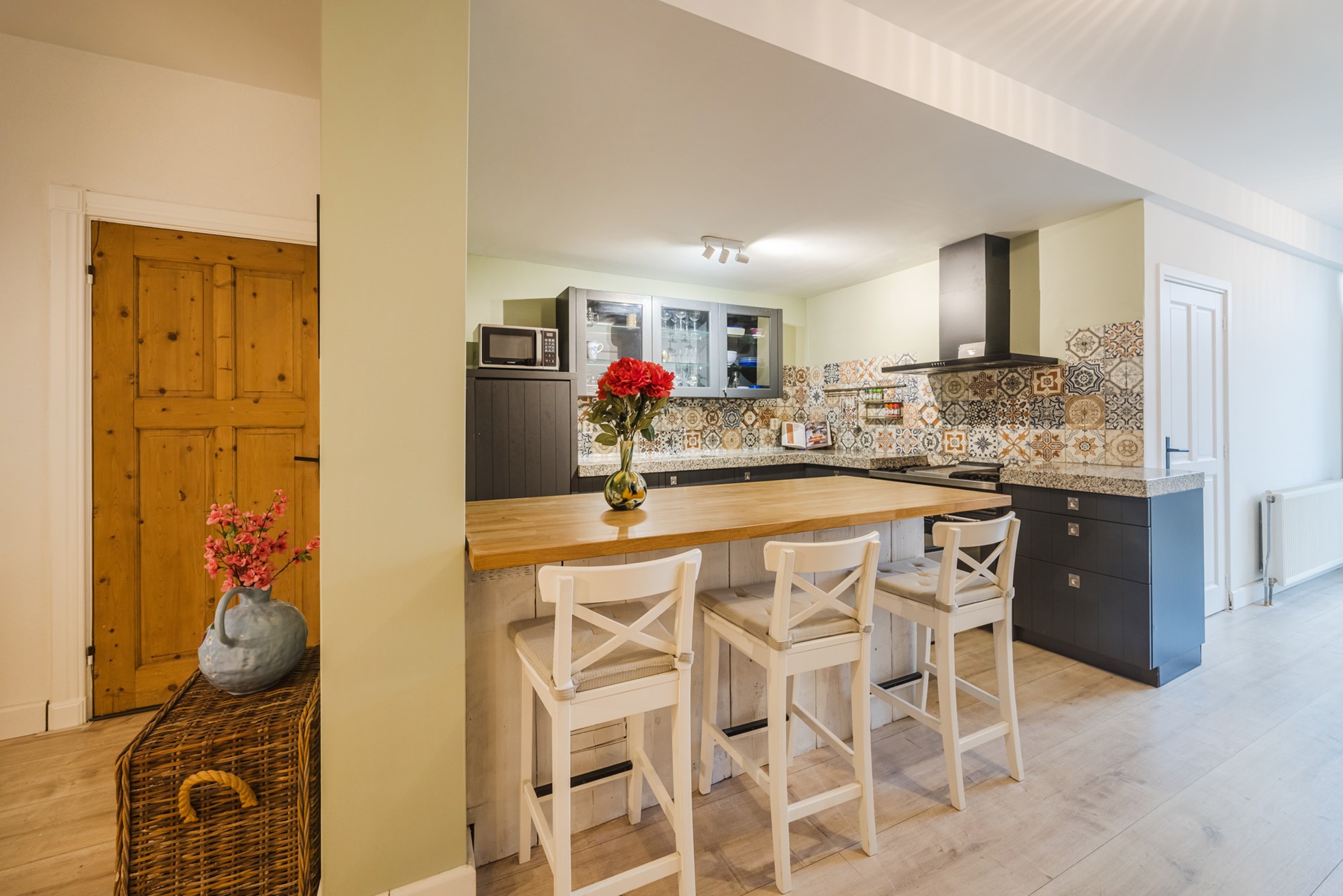 Aan de achterzijde van de woning ligt de woonkeuken, voorzien van een uitgebreide en nette hoek-keukeninrichting met volop kastruimte en complete inbouwapparatuur waaronder een uitgebreid kookfornuis. De keuken is een heerlijke plek, waar je ook informeel kunt zitten en een hapje eten. De tegelwand sluit mooi aan bij het karakter van de woning. Vanuit de keukenruimte loop je naar de bijkeuken met wasmachine-aansluiting, en vervolgens naar de, in 2025 compleet vernieuwde, badkamer. De badkamerruimte is netjes betegeld en heeft een wandcloset, een douchecabine, en een vaste wastafel met badkamermeubel.