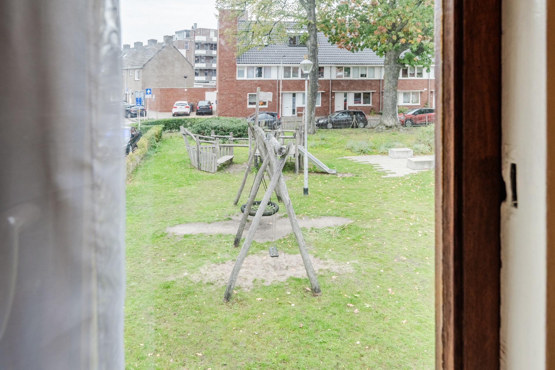 - woonkamer met uitzicht op het groene plantsoen aan het Commelinplein
