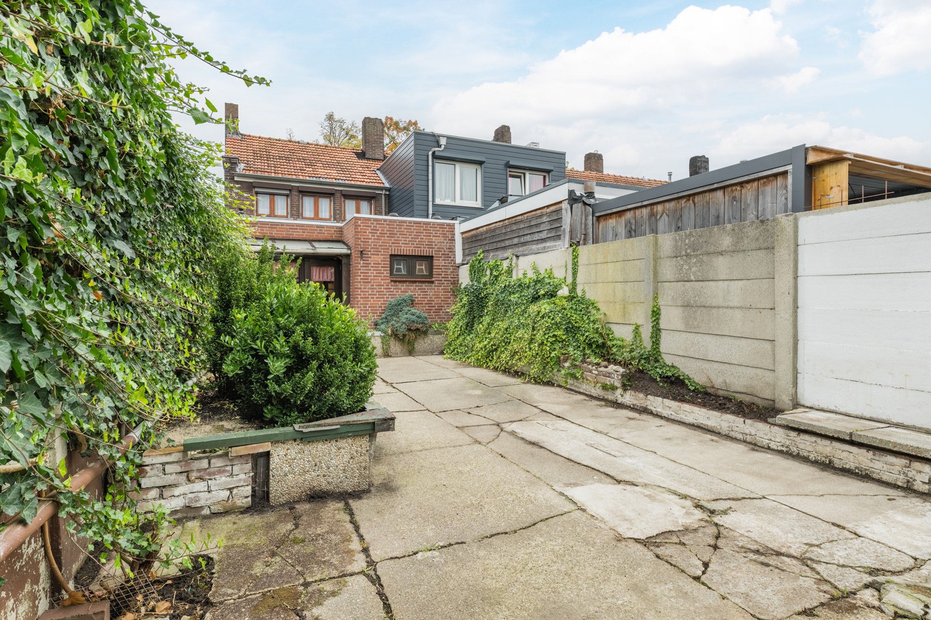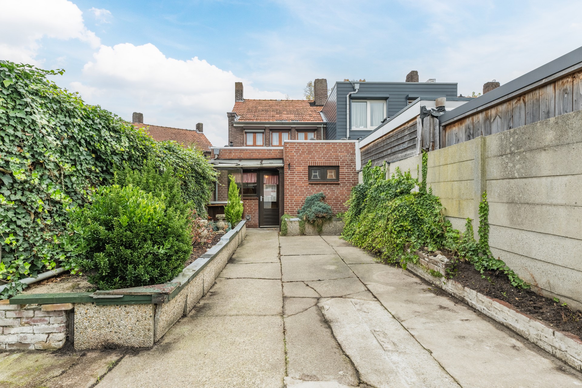 - ruime achtertuin met bestrating en borders en achterom
