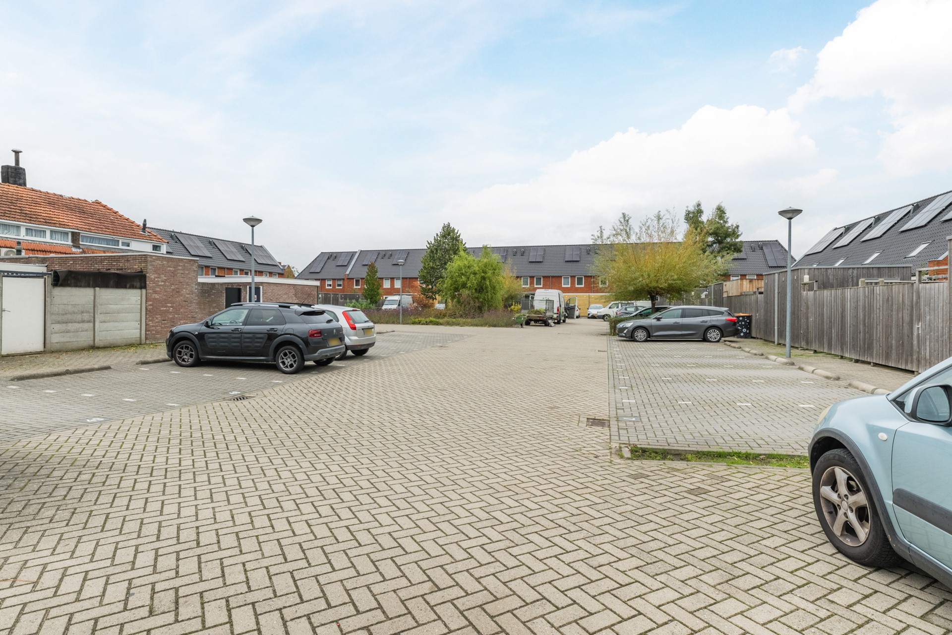 - via een overkapte inrit met toegangspoort aan het Commelinplein bereik je de garage met kanteldeur.