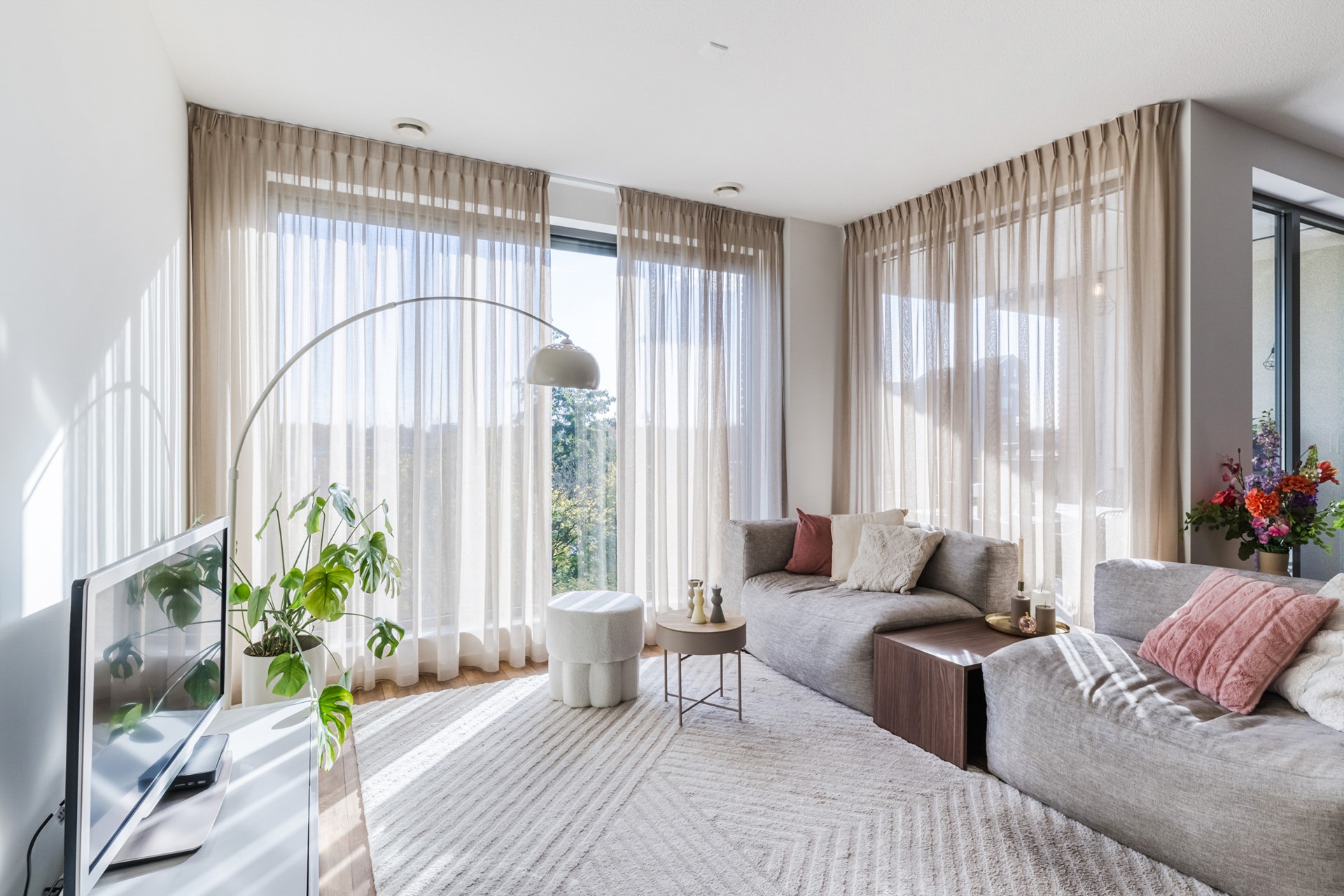 - de royale living kenmerkt zich door véél lichtinval door de royale raampartijen en gunstige zonligging (Zuiden). Hier merk je pas echt wat de voordelen zijn van de unieke ligging op de vierde verdieping. Comfortabel zijn de screens die nog geen jaar geleden zijn geïnstalleerd