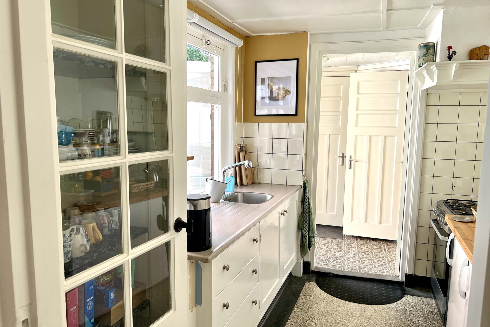 - keuken met authentieke granitovloer, deels wandbetegeling en opstelling keukeninrichting aan weerzijden van de woonkeuken. De authentieke servieskast en de granitovloer zijn hier nog aanwezig