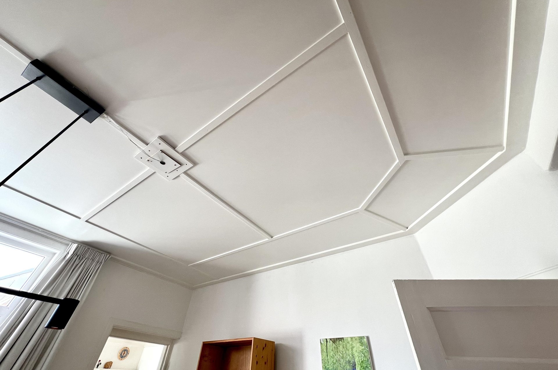 Hier ademt alles nog een jaren 30-sfeer; kijk maar eens naar de detaillering van het plafond, paneeldeuren en al het glas in lood in de ramen
