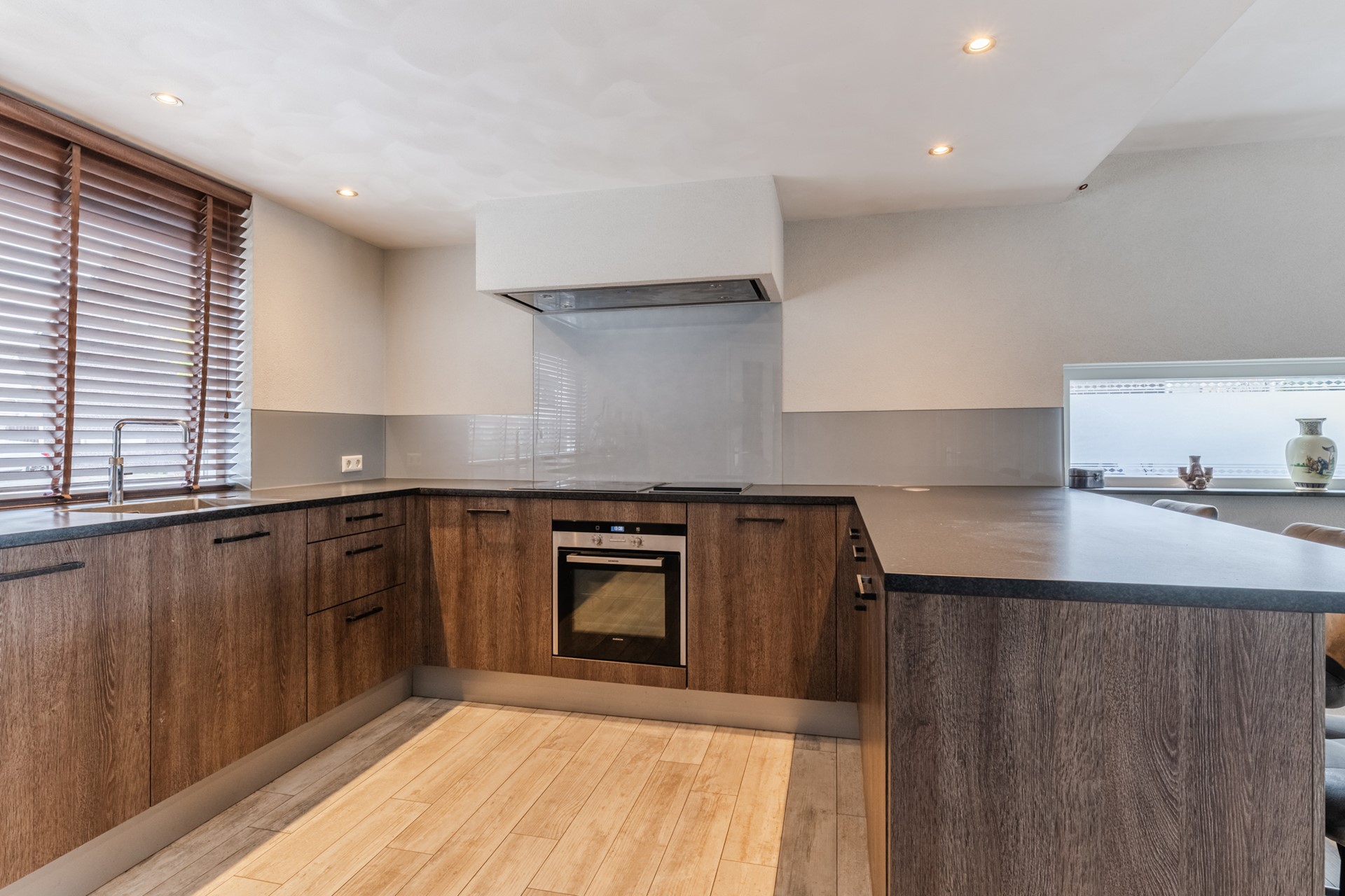 - open keuken aan de voorzijde met opstelling moderne keukeninrichting (hoekopstelling en extra keuken-element met extra zitgelegenheid). De keuken is zeer compleet met diverse kastjes en schuifladen, mooi werkblad met spoelbak en volop inbouwapparatuur: kookplaat, teppanyaki (ideaal voor de hobby-kok), afzuigschouw, vaatwasmachine, combi-oven, koelkast