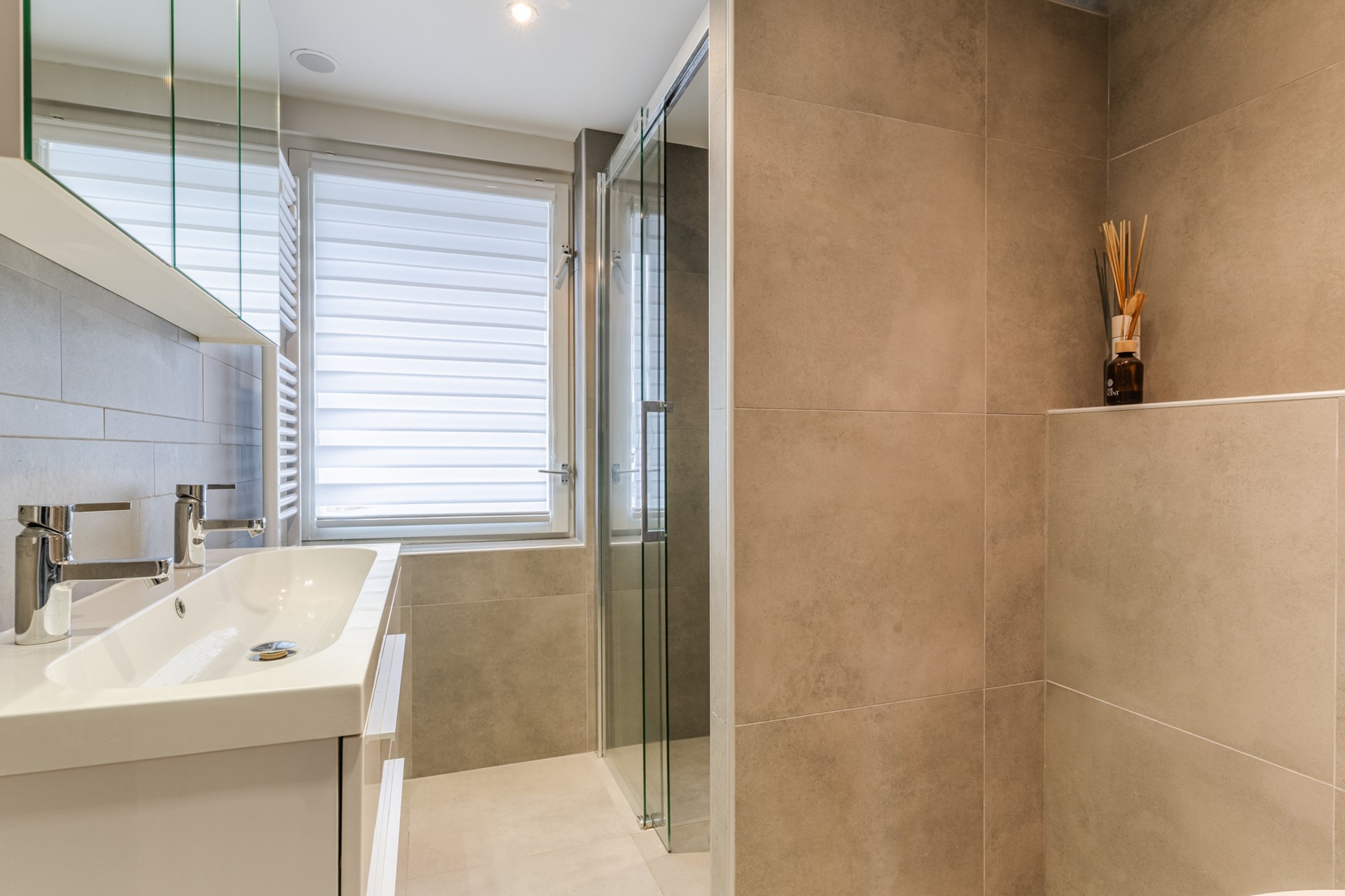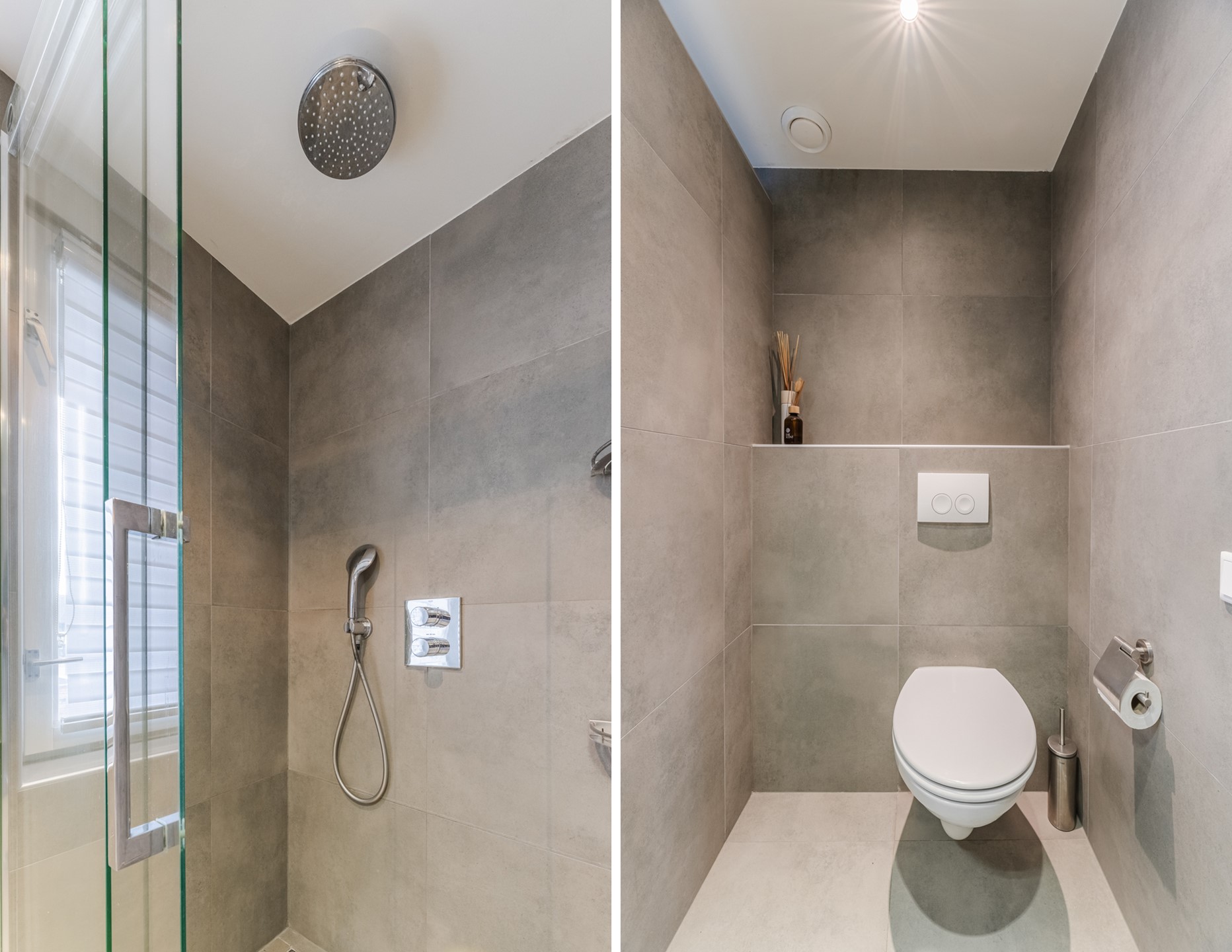 - moderne badkamer met inloopdouche die zowel een comfortabele handdouche als 'rainshower' heeft, dubbele vaste wastafel met moderne badmeubel en spiegelkast, 2e toilet (wandcloset) en designradiator