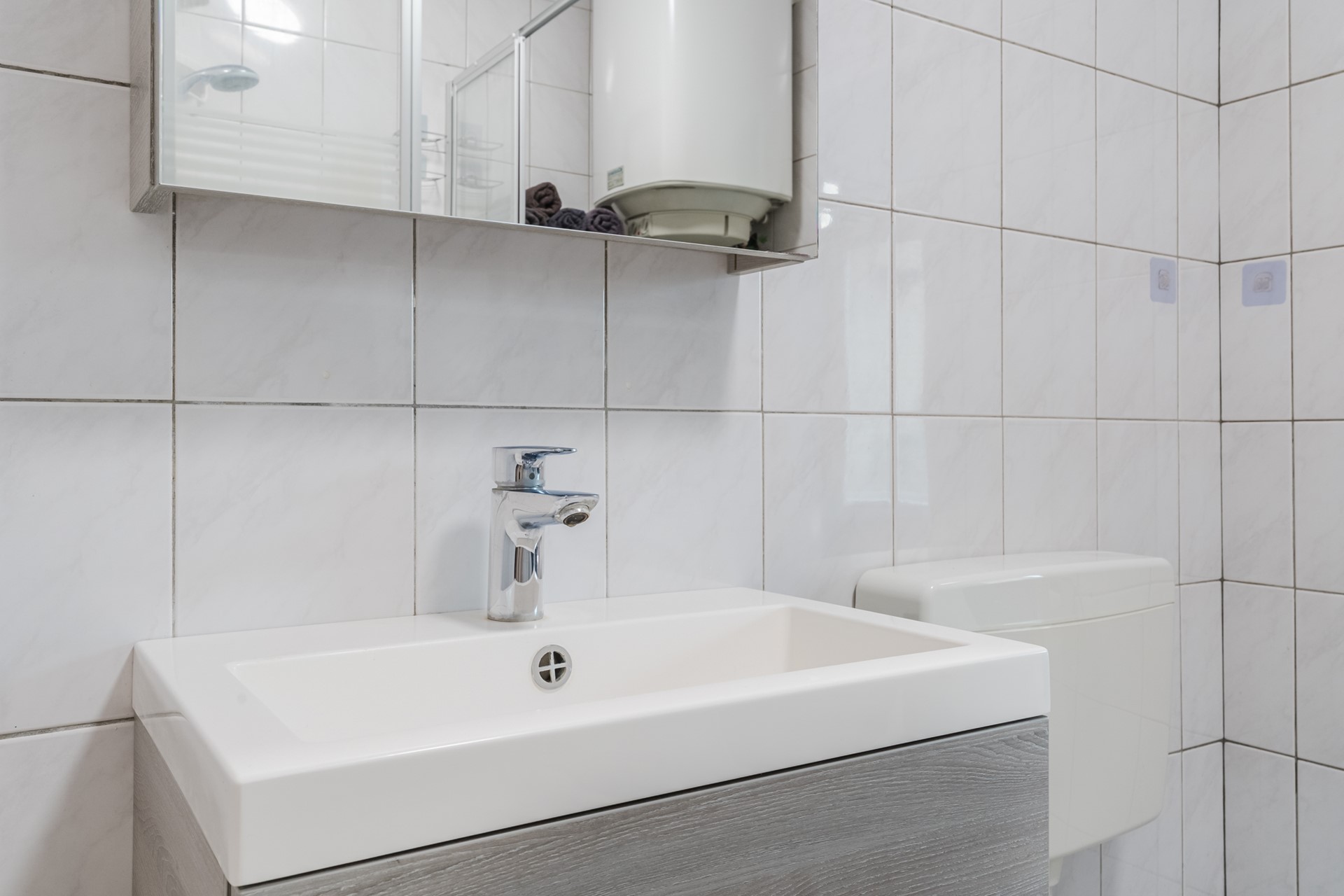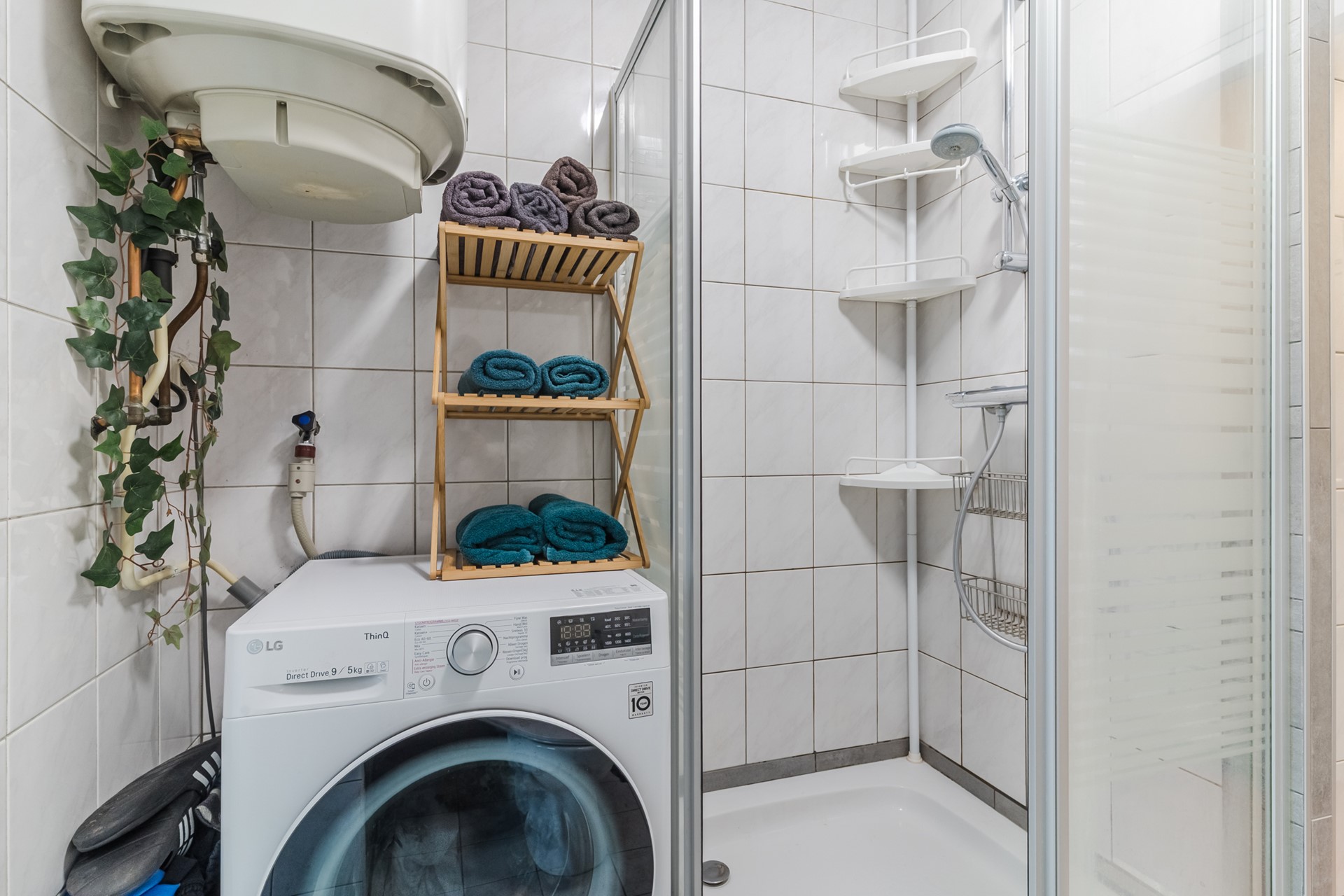 - badkamer met douche, vaste wastafel en closet en wasmachine-aansluiting, met opstelling boiler (eigendom)