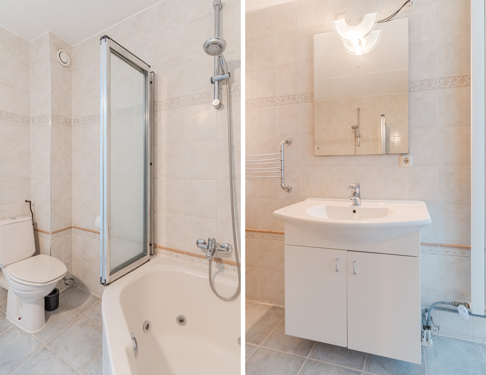 - badkamer met whirlpool-ligbad, vaste wastafel en 2e toilet en afgewerkt met warme tinten vloer- en wandtegels