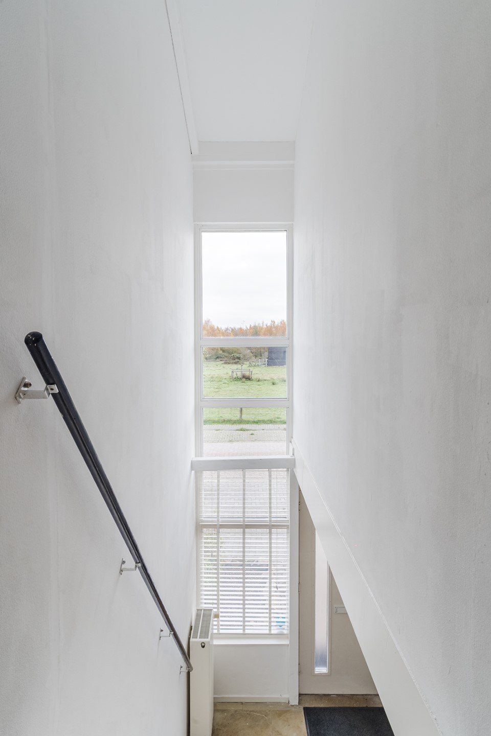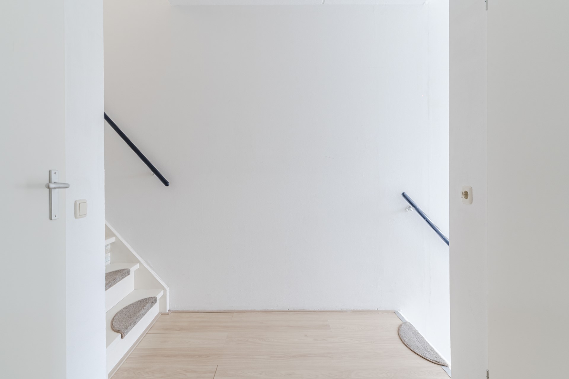 - ruime entreeruimte met trapopgang naar de 1e verdieping. Karakteristiek is de hoge raampartij en daardoor zeer royale lichtinval wat voor een extra kwaliteit zorgt